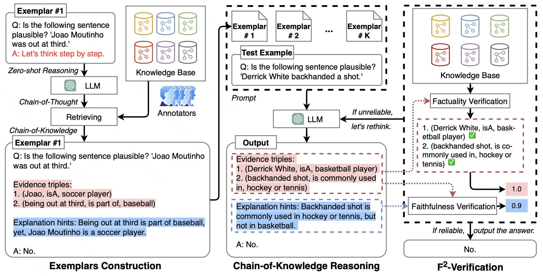 一般地,不论是常识推理还是符号推理,虽然可以通过最终大模型预测的答案来判断其推理过程中间是否可能出错,但是想具体定位到错误的步骤是比较困难的。为此,我们借助CoK提示的结构,尝试将其与外部知识库进行对齐。