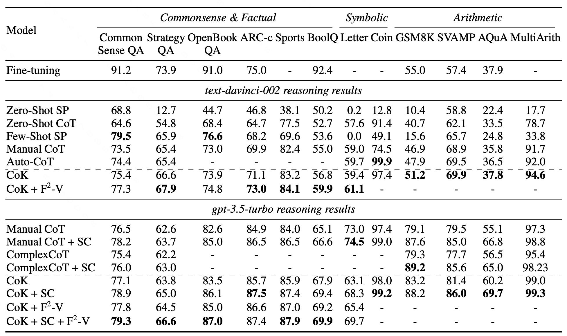 作者在包括常识与事实推理、算术推理和符号推理等任务上进行了实验。挑选了包括text-davinci-002、gpt3.5-turbo和gpt-4作为大模型基座。实验总体结果如下: