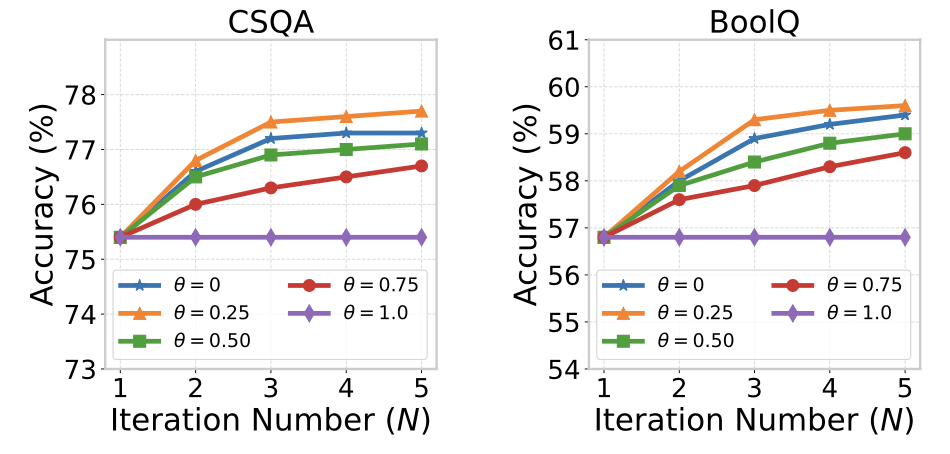 在BoolQ和CSQA上进行实验来验证再思考算法的收敛性,可发现大多数情况下大模型可以在第3轮回答正确。