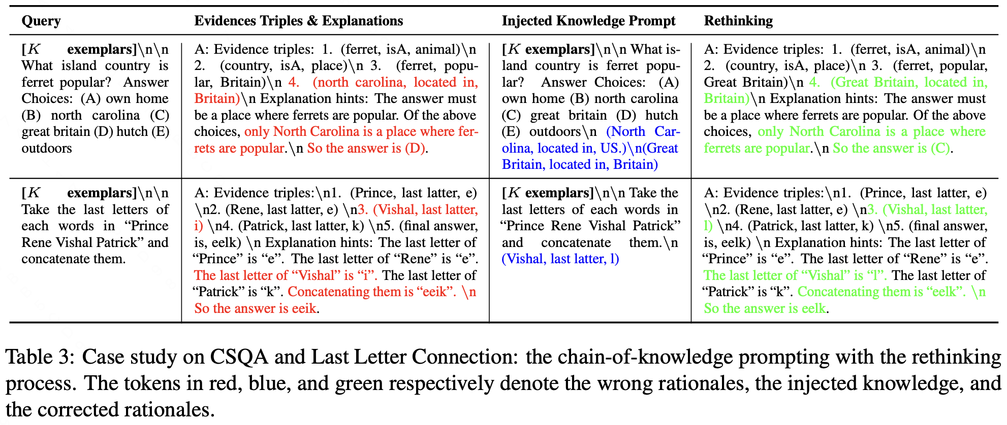 通过观察一些Case,可以发现在CoK的提示下,大模型可以生成出结构化的推理路径,并能够在再思考算法的增强下不断地提高准确性。